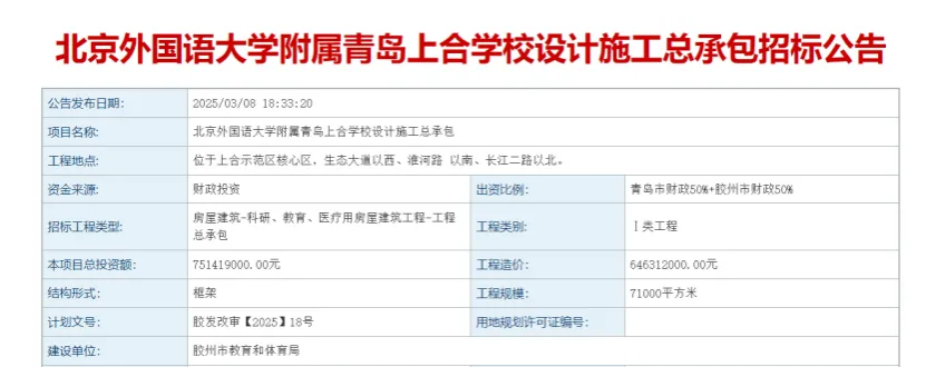 去年3月,皇冠篮球比分网_澳门现金网-球探体育:市公共资源交易电子服务系统公示了北京外国语大学附属皇冠篮球比分网_澳门现金网-球探体育:上合学校设计施工总承包招标公告。其中提到,计划施工开工日期为7月6日,竣工日期为2026年7月31日。