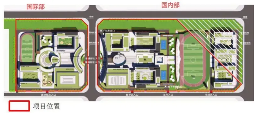 其中,国际部占地面积约43675㎡,建筑面积约33000㎡,打造十五年一贯制教学体系,包括幼儿园、小学、中学全学段,设学规模设定为15个班,预计可容纳学生375人。