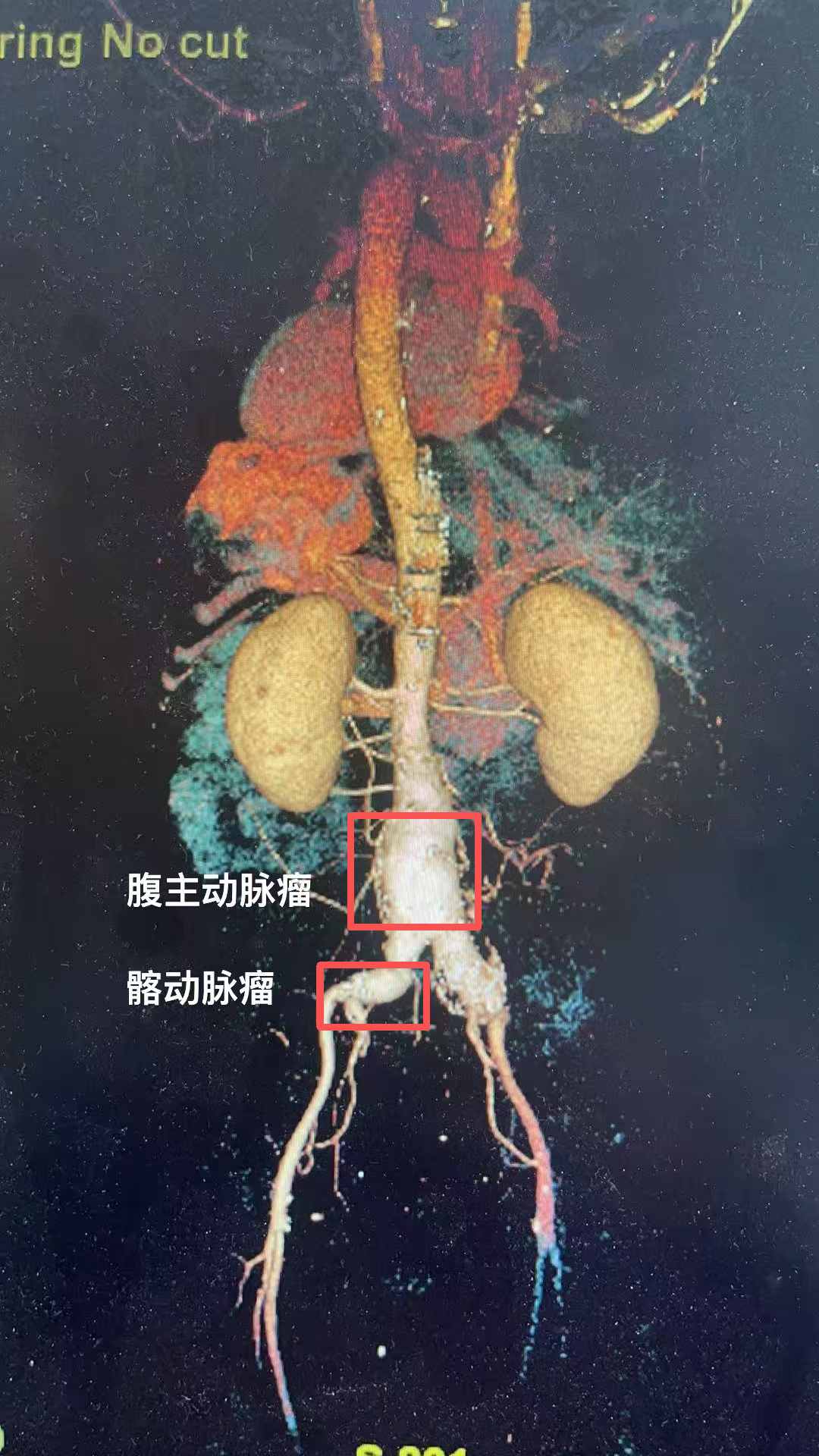 这两位患者情况差不多,他们平日里身体并无明显不适,在一次常规体检中,腹部超声检查结果显示,腹主动脉存在瘤样扩张,进一步检查确诊为腹主动脉瘤,并同时累及双侧髂总动脉,形成髂动脉瘤。